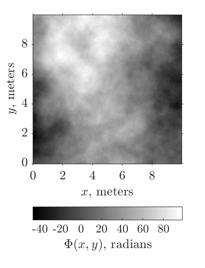Далее генерируется 2D-массив случайных чисел с нормальным распределением и умножается на корень Колмогоровского спектра мощности фазовых искажений: